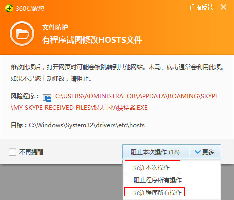 由于[银天下防挟持器.exe]是具有 防止恶意网址劫持 的功能,所以,启动程式的时候,程式会 修改电脑的DNS IP地址,容易造成电脑安装的杀毒程式、安全卫士 误认为病毒程式,而进行拦截。只需如下图:勾上 “不再提醒”,再点击 “允许本次操作”或 “允许程序所有操作”,以后打开防劫持器就可以直接进入网站了!