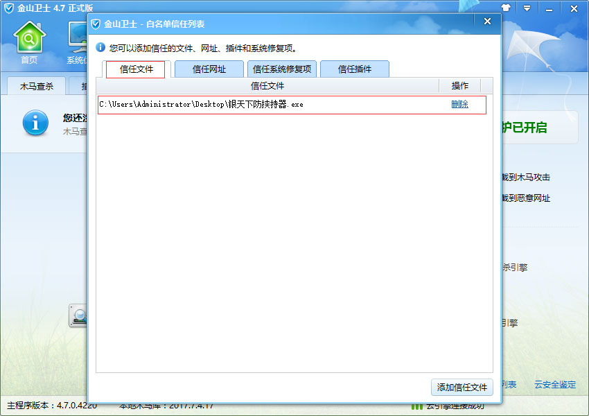选择“查杀木马”,在右下角找到“信任列表”,打开后选择“信任文件”,将“银天下防挟持器.exe”文件,加入信任列表。