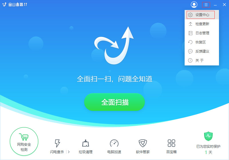 点击右上角“菜单”图标,选择“设置中心”,进入后,切换到“安全保护”的“信任设置”,在文件/文件夹那里将“银天下防挟持器.exe”文件,加入信任列表。